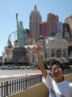 ベガスは、空港内からもう大人のゲームセンターなのだぁ! 05.5.30 今年の家族旅行は父はパス、一行は母と友達中田クンの三人。行く先には沢山の仲間が待っている予定。父は宿題に追われている?と、ゆーか、今年は家を離れられない状況のよーだ。 三人は先ず早朝ロスアンジェルスに入国。明けてまもない爽やかな青空の下、約9時間の飛行の腰!を、一度シャンと延ばすために、エァターミナルの外に出た。 毎年恒例の初夏の家族旅行も、去年は行かれなかったので久しぶり。 ちょいとL.A、朝の空気を吸ってすぐに国内線に乗り換え、更に二時間の飛行を終えると、そこはネバダ砂漠に突然現れた高層ビル群、歓楽の街、ラスベガス。ショウの本場なのだった! ショウが好き! と言いつつ、ベガスには行く機会がなかったから初ベガスラスベガスがす。 もう空港内からズラリと並ぶゲームケームゲーム! チーンジャラジャラジャラとキャッシュ飛び交うスゴイ街。 と、言っても賭博一切興味なしのボクとしては、通りすがりにレビューショウの本場に寄り道、と言う感じなのです。 ラスベガスは真夏だった。 もうみーんな浮かれた顔して遊びに来ている場所。 どこもかしこもキラキラしていて夜は来ない。 先ずは予約したショウのチケットを取りに、午後のベガスを初歩き、と思ったけれど、ホテル内が広すぎて、外に出られないまま気がつけば、その青く高い空は作り物の天井。 ポツポツと降り出した噴水の池に輪を作る雨も仕掛けた雨。 ホテルの中も、外もテーマパーク! と、言う 噂に聞いたウキウキなこのサプライズな雰囲気。 東京のイクスピアリの何倍もの規模のショッピングモールだったのだ。 ホテルの外に出るのに、不思議マジックな、さまざまな仕掛けに楽しく騙されながら、やっとホテル外に出たらウワァ! 本当の空は抜ける様に高く青く、なんと美しく新しい街! ベガスごとテーマパーク、と言うだけあって、そびえ立つエッフェル塔や凱旋門、さまざまな国の美しさをテーマにしたホテルが競い合ってその規模は、全てが本物を凌ぐダイナミックさ! この街にはアラビアもパリもニューヨークもハリウッドもあり。 本気で全ての大人の夢を現実に作ってしまう所がスゴイ! 伝統のあるショウのリゾート地、ラスベガス!! |
